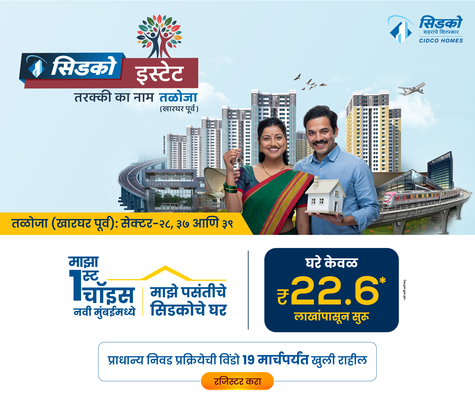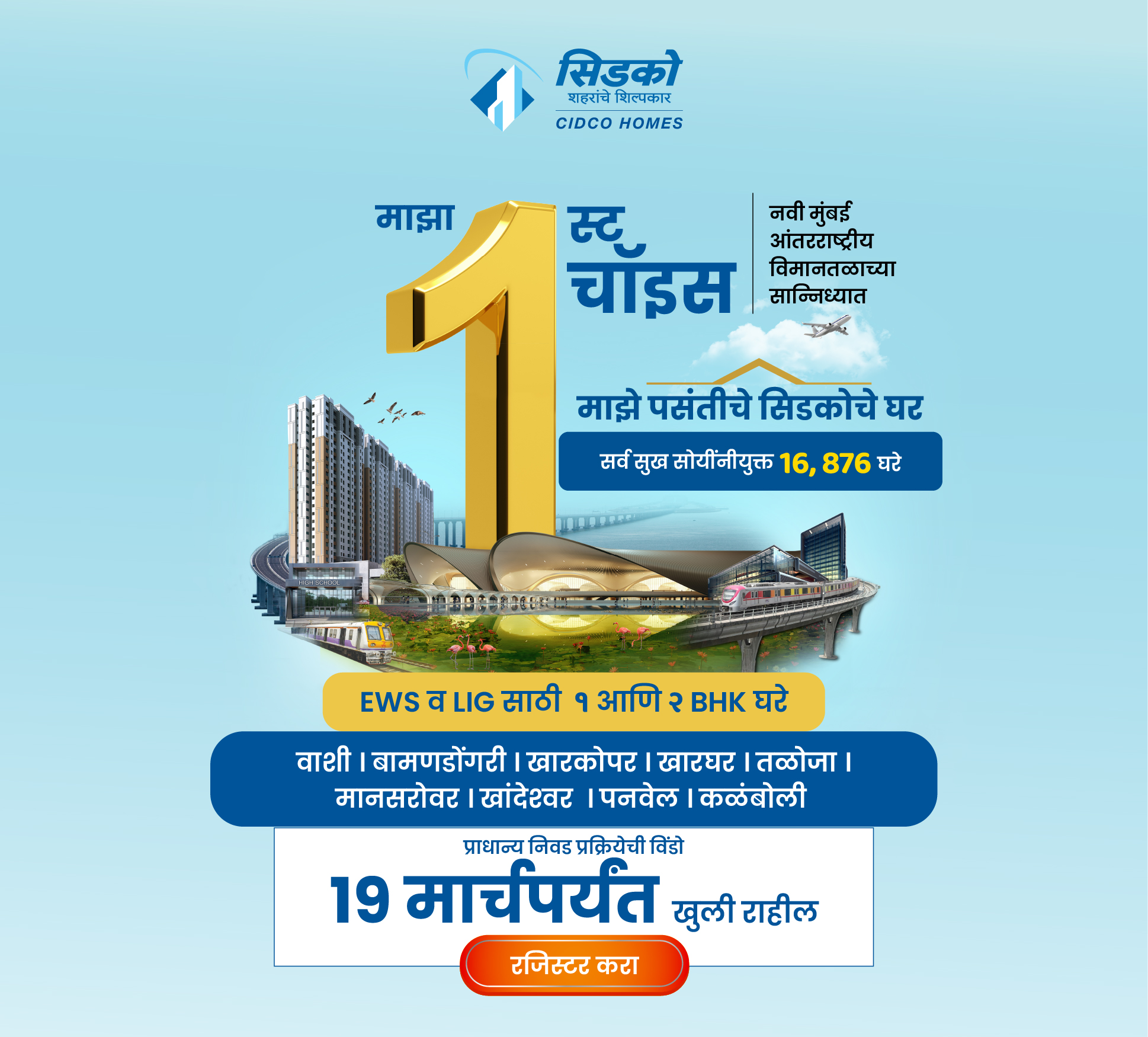 ही एक विशेष संधी आहे, जिथे सिडको इच्छुक खरेदीदारांना पसंती कालावधीत प्रकल्प, टॉवर आणि मजल्यांची संख्या निवडण्याची परवानगी देते. तपशिलांसाठी, ऑनलाइन रजिस्ट्रेशन बुकलेट पहा (डाउनलोड्स / हेल्पडेस्क विभागात उपलब्ध आहे).