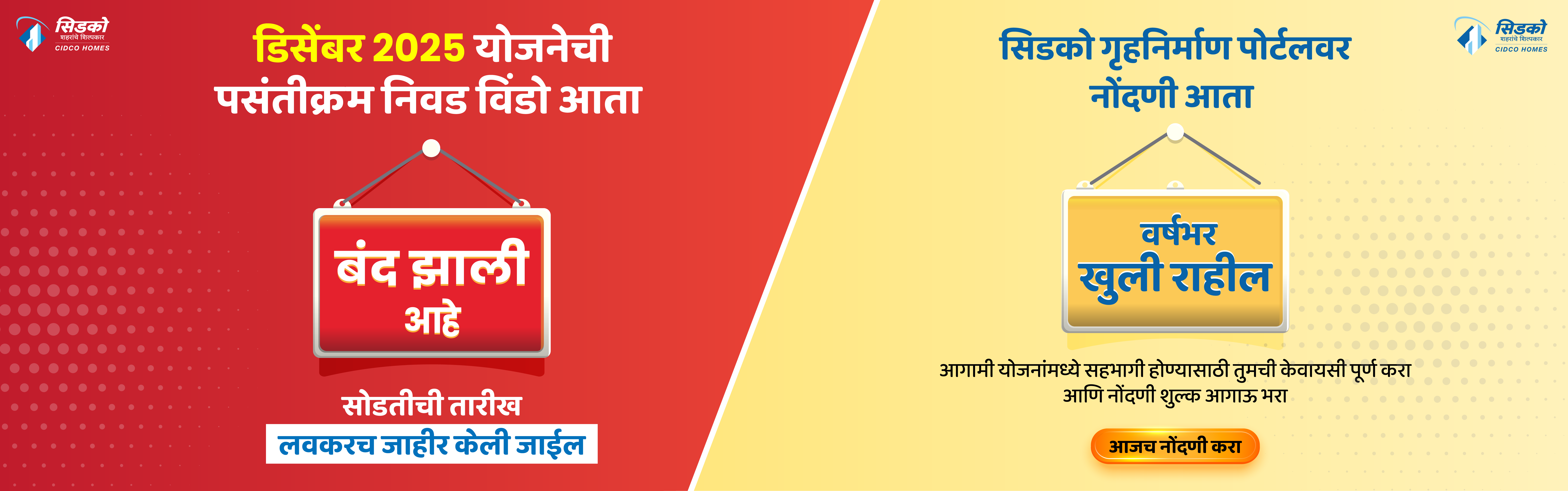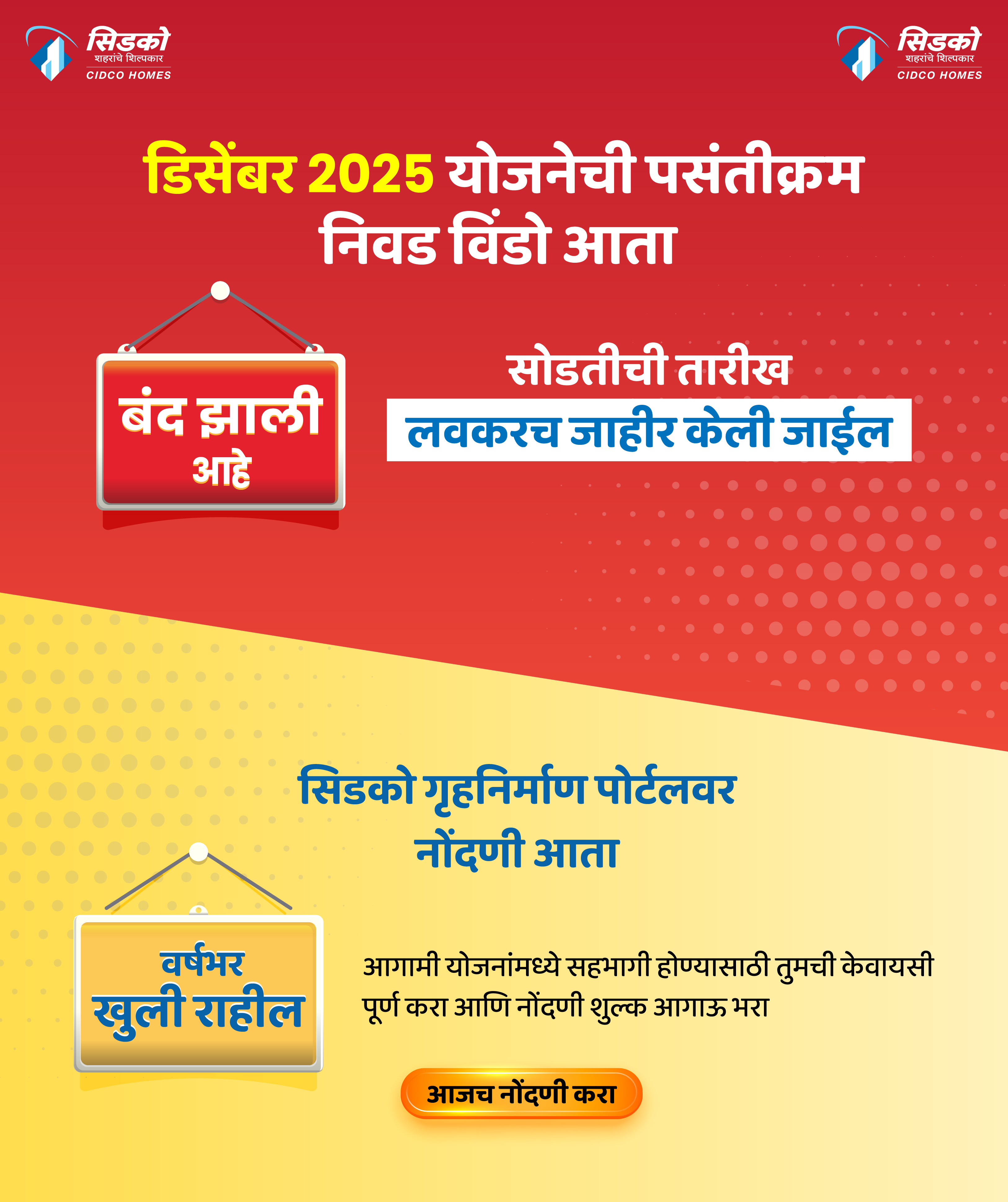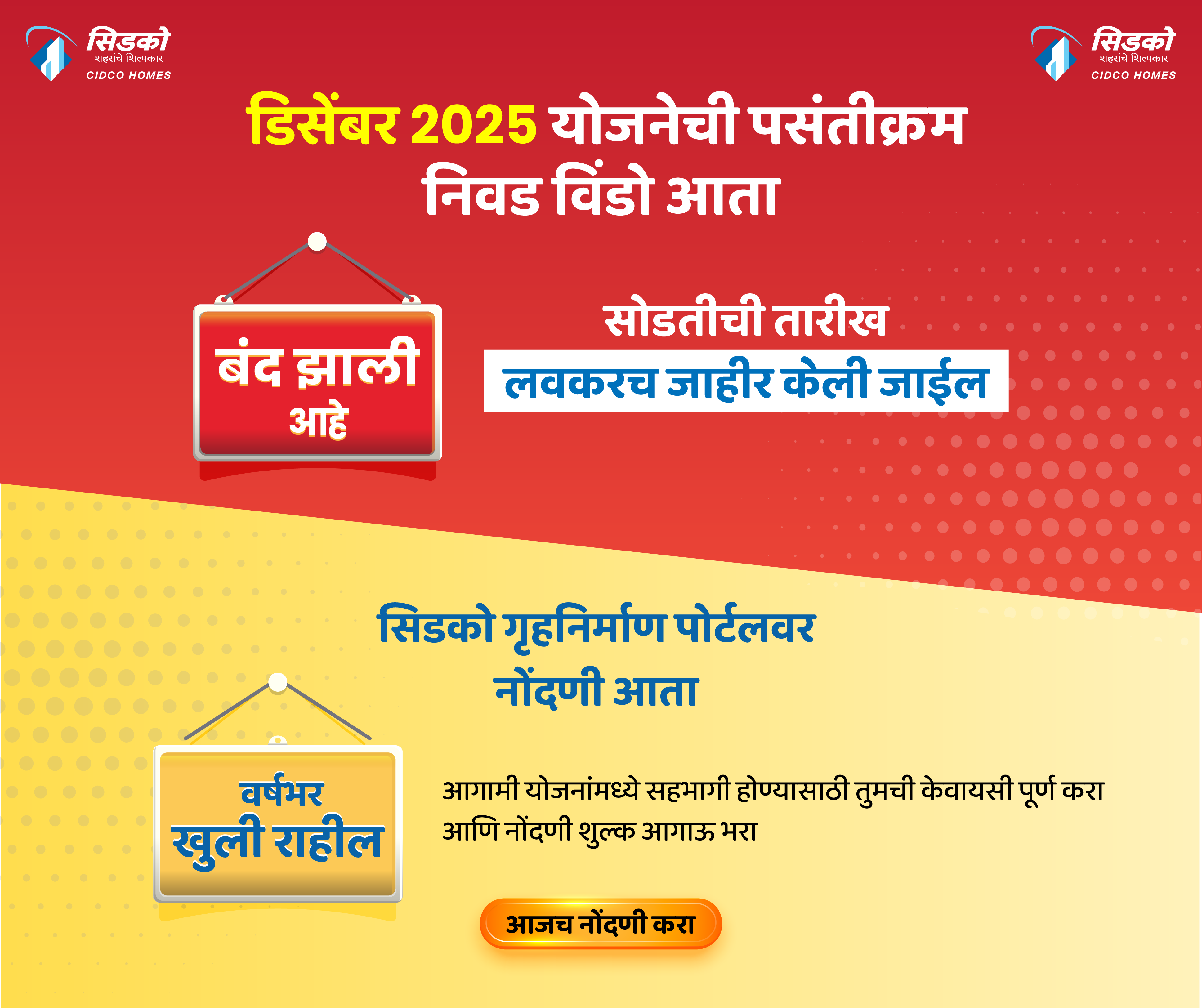 डिसेंबर 2025 योजनेची लॉटरी लवकरच जाहीर केली जाईल. अर्जदारांनी नियमित अंतराने सिडकोच्या वेबसाइटला (www.cidcohomes.com) भेट द्यावी. याव्यतिरिक्त, आम्ही सर्व नोंदणीकृत अर्जदारांना सिडको ॲप आणि एसएमएसद्वारे सूचना पाठवू. डिसेंबर 2025 योजनेसाठी ऑनलाइन रजिस्ट्रेशन आता सुरू आहे.