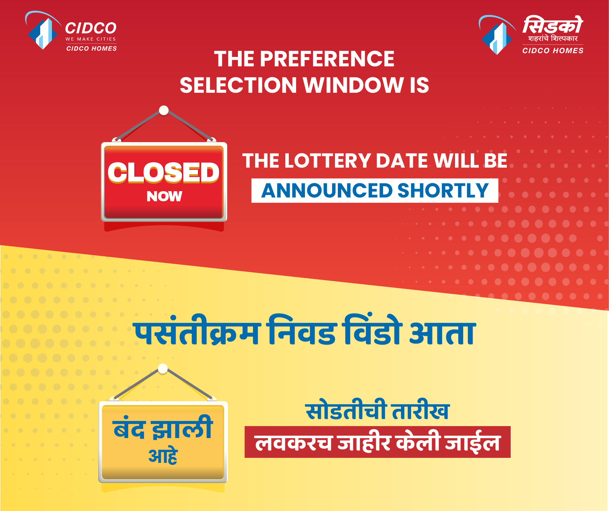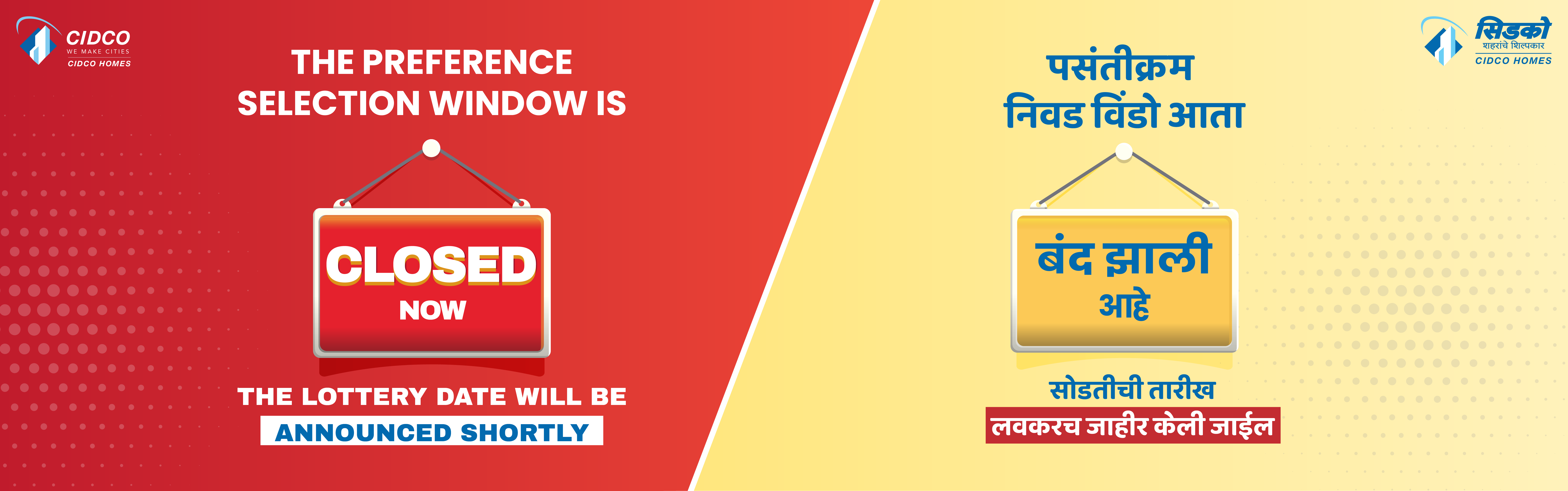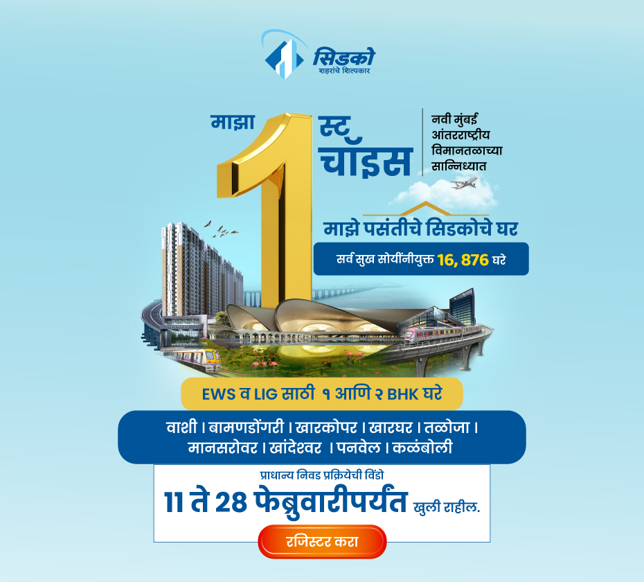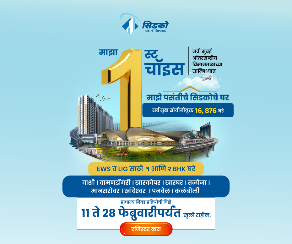 डिसेंबर 2025 योजनेची लॉटरी लवकरच जाहीर केली जाईल. अर्जदारांनी नियमित अंतराने सिडकोच्या वेबसाइटला (www.cidcohomes.com) भेट द्यावी. याव्यतिरिक्त, आम्ही सर्व नोंदणीकृत अर्जदारांना सिडको ॲप आणि एसएमएसद्वारे सूचना पाठवू. डिसेंबर 2025 योजनेसाठी ऑनलाइन रजिस्ट्रेशन आता सुरू आहे.