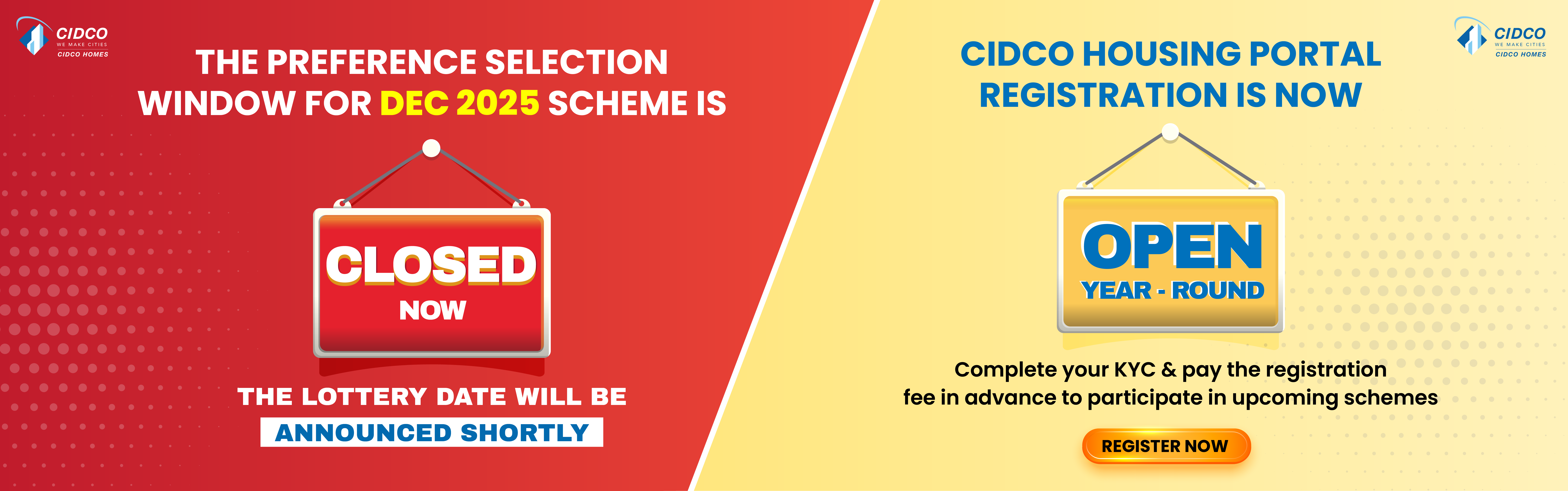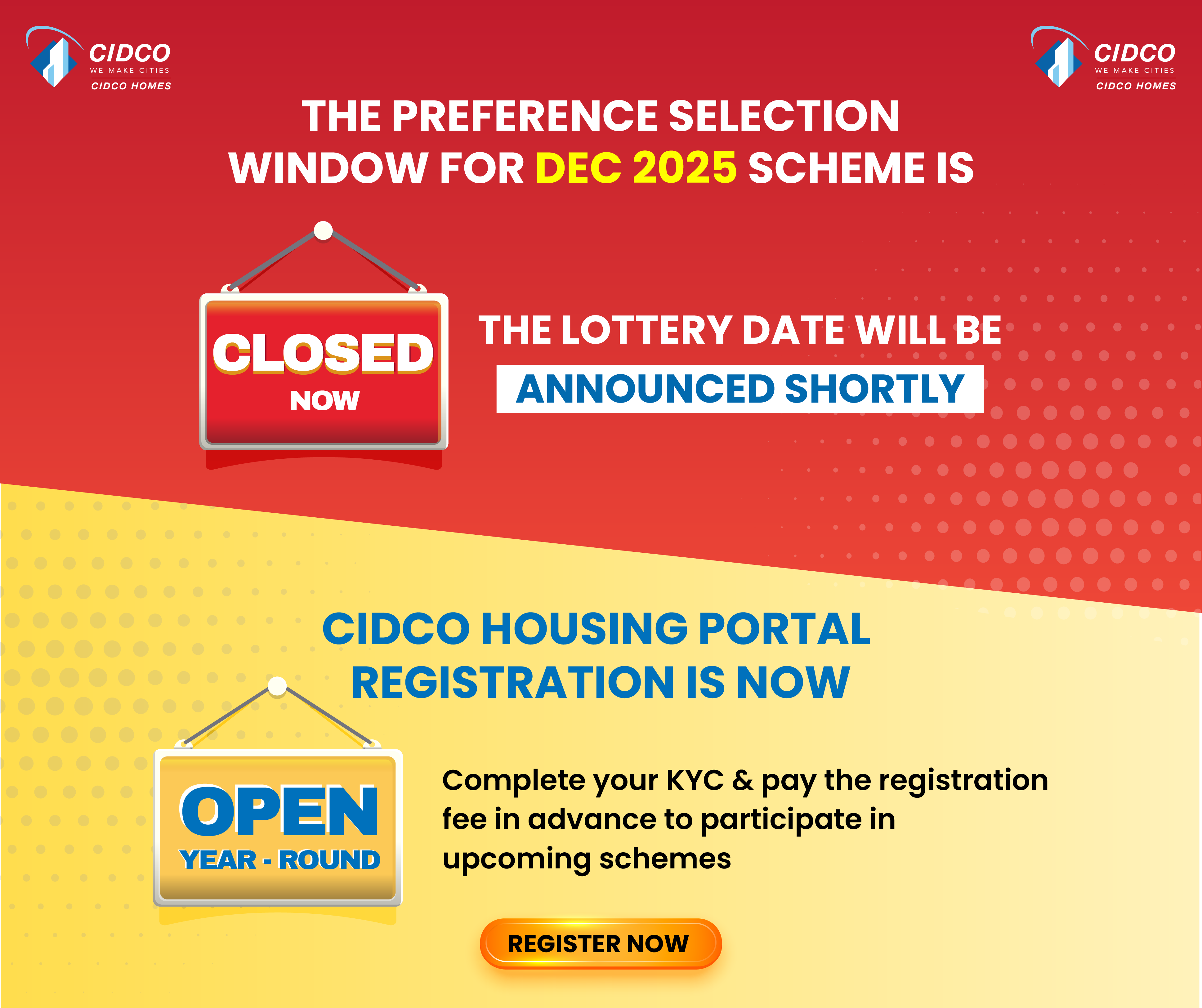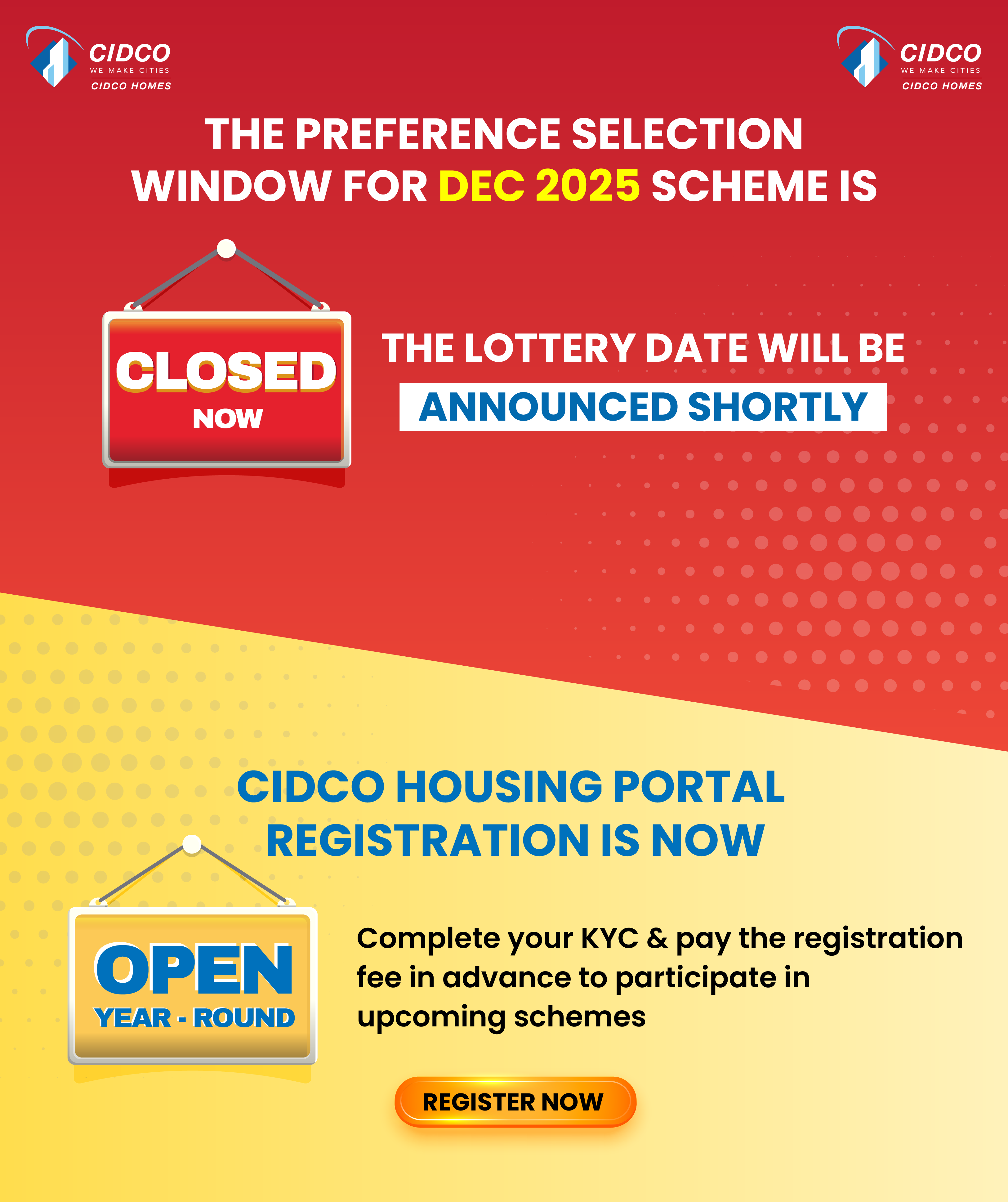 The lottery for the December 2025 scheme will be announced soon. Applicants must visit the CIDCO website (www.cidcohomes.com) at regular intervals. Additionally, we will send notifications through the CIDCO app and SMS to all registered applicants. Online Registration for the December 2025 scheme is now open.